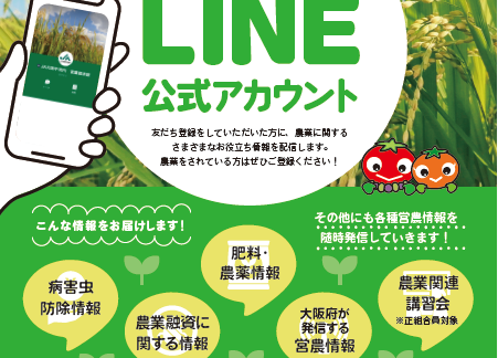 生産者の方 募集 2025年 10月 23日 農業に関するお役立ち情報を配信!JA大阪中河内 営農経済部の公式LINEが開設! 2025年9月より、JA大阪中河内 営農経済部の公式LINEが開設されました!本LINEでは、・病害虫防除情報・農業融資に関する情報・肥料・農薬情報・大阪府が発信する営農情報・農業関連講習会(※正組合員の方対象)など...