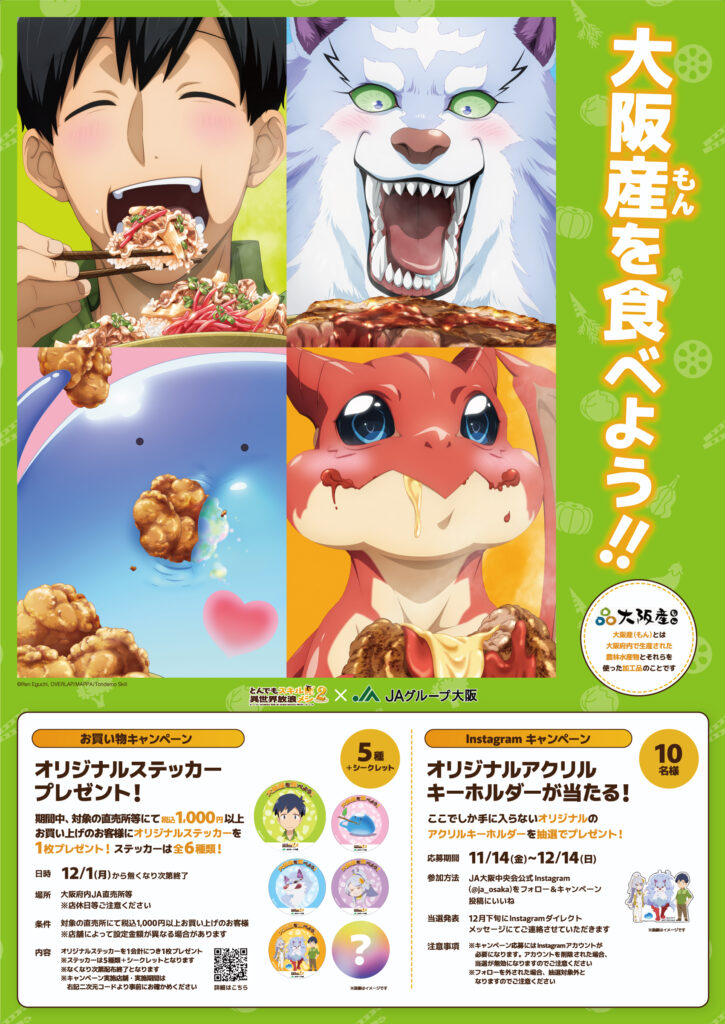 また、JA大阪中央会Instagramのフォロー&対象の投稿へのいいねで、「とんでもスキルで異世界放浪メシ2」との限定コラボアクリルキーホルダーが当たるキャンペーンも開催中!
