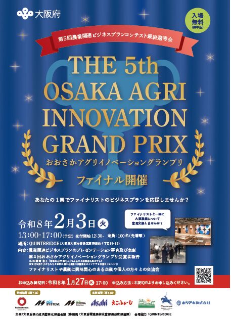 JAグループ大阪は大阪府との共同事業である「大阪農業イノベーション推進事業」の一環として、農業関連ビジネスプランを競う「第5回おおさかアグリイノベーショングランプリ」の最終選考(ファイナル)を開催いたします。
