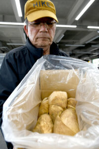 JAいずみのは3月22日、営農総合センターで、筍(たけのこ)生産出荷組合による特産のタケノコの初出荷を迎えました。2026年産は降水量が少なかった影響で小ぶりでしたが、初日は33箱(1箱2㌔)と前年度の4倍超の出荷がありました。今後、気温の上昇とともにサイズも量も増えていく見込みです。