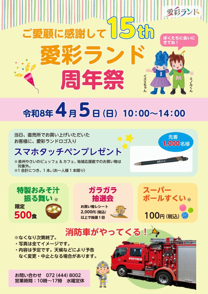 JAいずみのの農産物直売所「愛彩ランド」は2026年4月5日、オープン15周年を迎えます。日頃のご愛顧に感謝を込めて、記念日当日となる4月5日に周年祭を開きます。